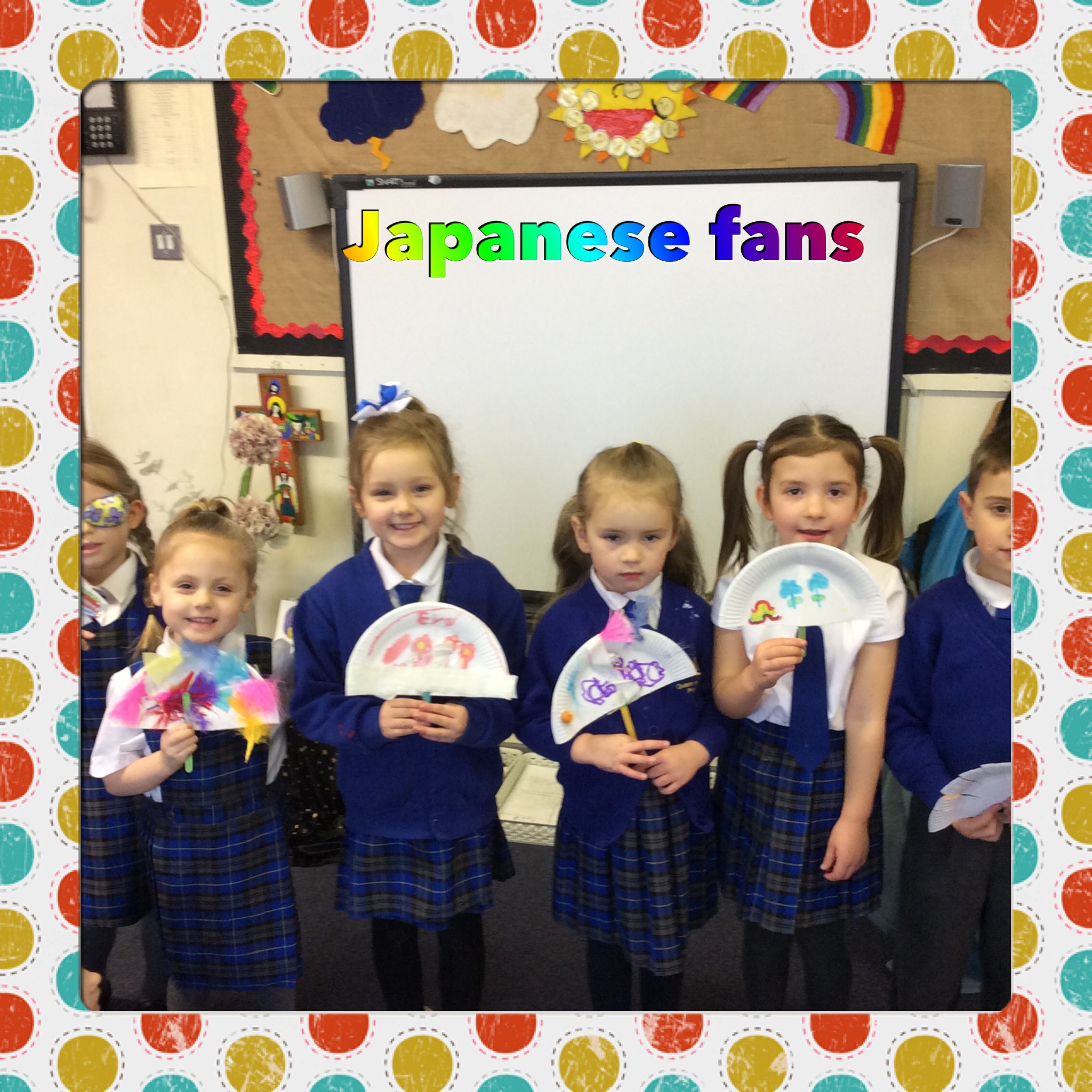 This week saw the start of our Arts Fortnight and we begn to look at the country of Japan. We have found out lots of interesting facts. In class we have made mountains using boxes to look like the Japanese landscape and took a trip on the bullit train, we even made pretty fans to cool us down we get hot.